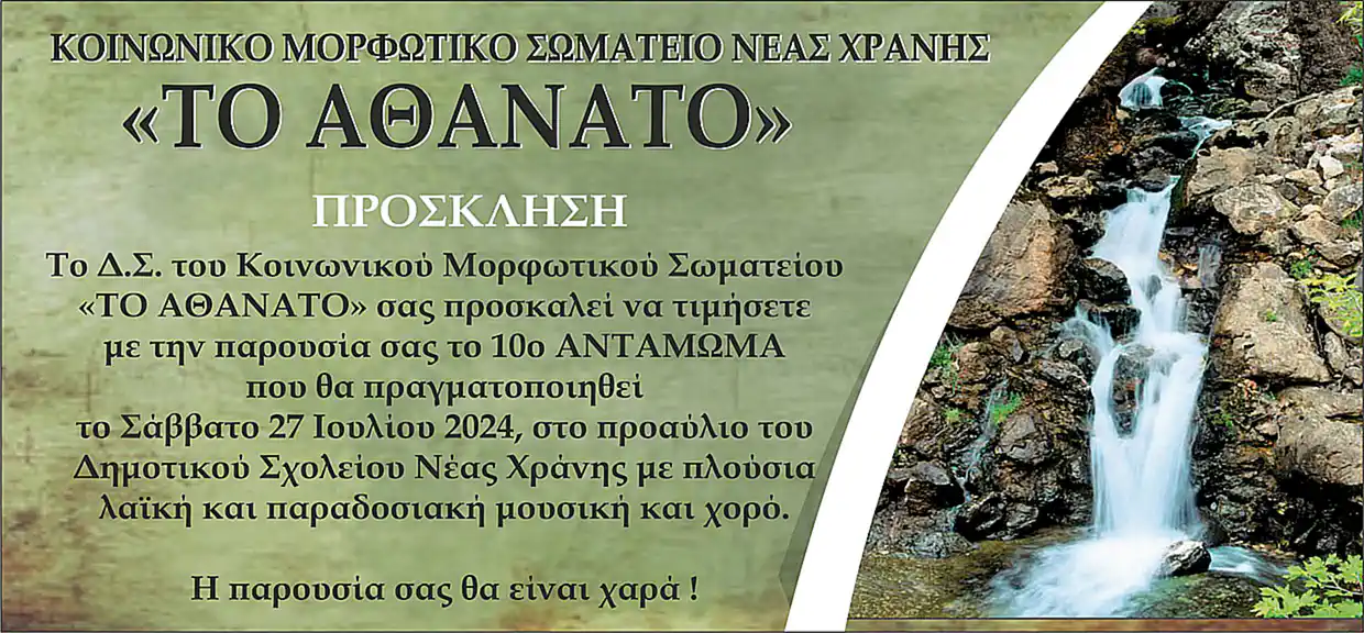 Το Διοικητικό Συμβούλιο του Κοινωνικού Μορφωτικού Σωματείου Νέας Χράνης «Το Αθάνατο» διοργανώνει και σας προσκαλεί στο «10ο Αντάμωμα», το Σάββατο 27 Ιουλίου 2024, στον αύλειο χώρο του Δημοτικού Σχολείου, στην Νέα Χράνη.