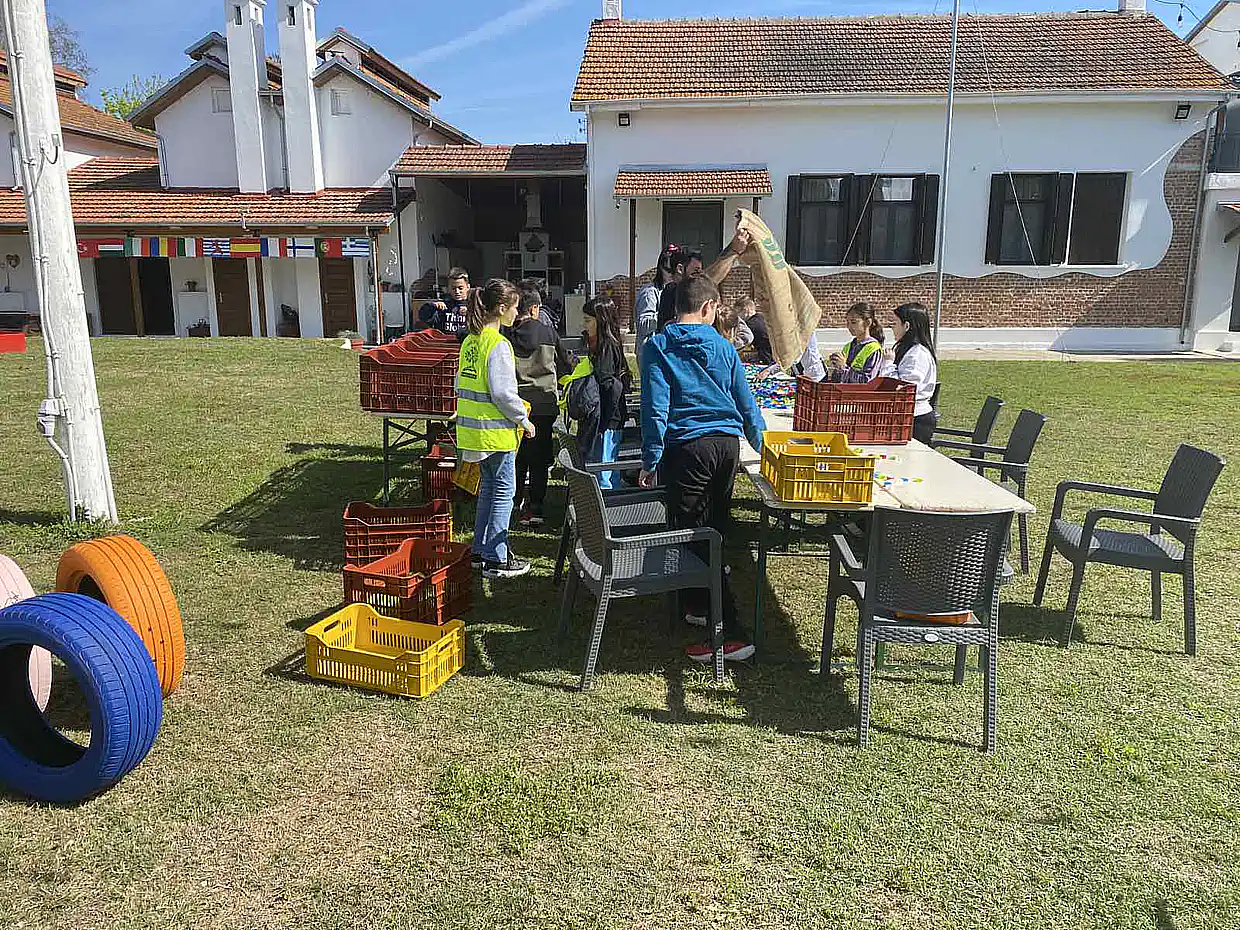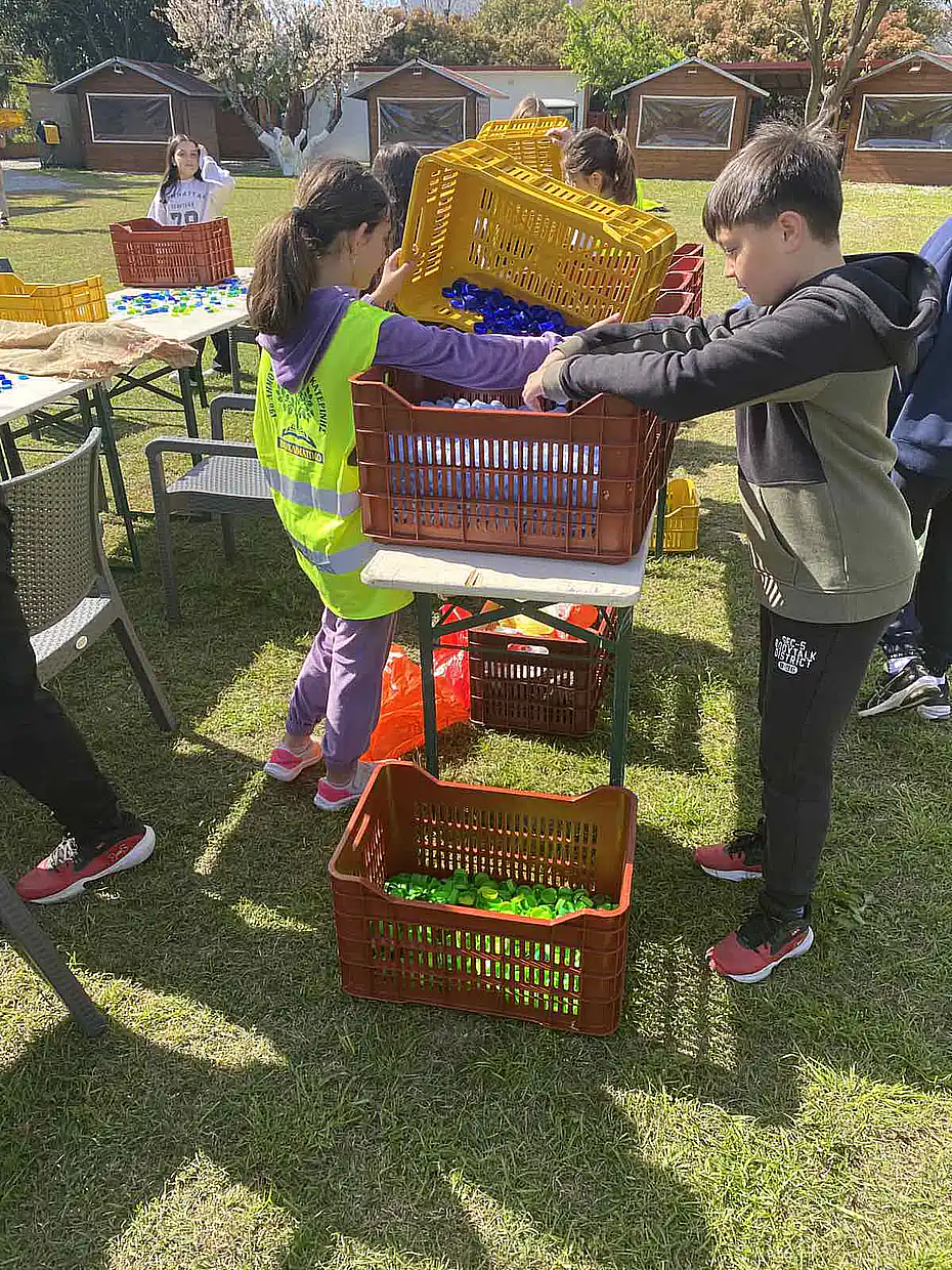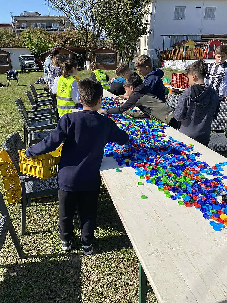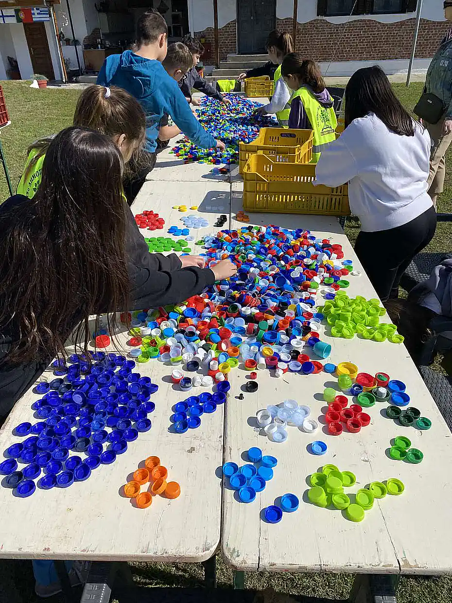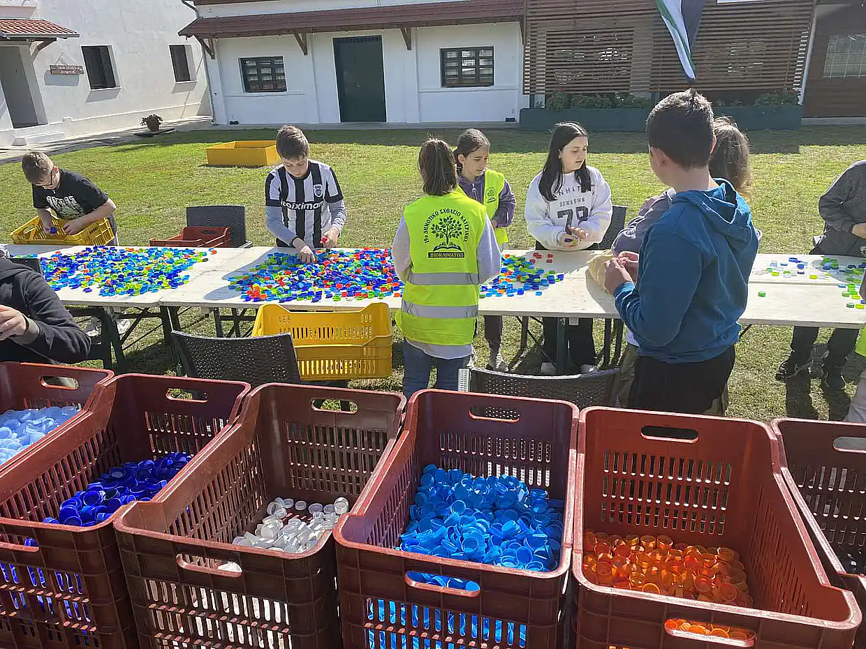 Ακολούθησε βιωματική δράση, όπου οι μαθητές προχώρησαν σε διαχωρισμό καπακιών από πλαστικά μπουκάλια ανά χρώμα. Τα καπάκια θα χρησιμοποιηθούν σε οικολογική κατασκευή, ενισχύοντας έτσι το μήνυμα της επαναχρησιμοποίησης και της δημιουργικής ανακύκλωσης.