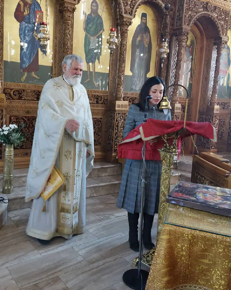 Κυρία Γεωργία Γραίκου, η Ενορία μας ως δείγμα τιμής και αναγνώρισης της αξιέπαινης επιστημονικής σας προσπάθειας, σας επιδίδει ως ευλογία και αναμνηστικό από το φετινό 28ο ΑΝΤΑΜΩΜΑ, μια εικόνα η οποία έχει στο κέντρο της τον Άγιο Δημήτριο για τον Ιερό Ναό του οποίου, κοπιάσετε τόσο πολύ κατά τη διάρκεια της έρευνας και συγγραφής της μεταπτυχιακής σας εργασίας. Επίσης, στις 4 γωνίες της ιερής εικόνας απεικονίζονται: η Αγία Παρασκευή Προστάτις και Πολιούχος της Ενορίας μας, ο Άγιος Γέωργιος ο Χιοπολίτης, ο οποίος αποτελεί τον προσωπικό σας Άγιο και στην μνήμη του οποίου γιορτάζετε την ονομαστική σας εορτή, ο Άγιος Διονύσιος εν Ολύμπω, Προστάτης και Έφορος της Πιερίας μας και η Αγία Αικατερίνη, Προστάτις και Πολιούχος της πρωτεύουσας του Νομού μας.