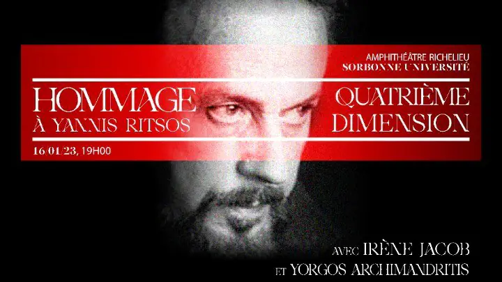 Μεγάλη βραδιά αφιερωμένη στον Γιάννη Ρίτσο διοργανώνει το Ελληνικό Ίδρυμα Πολιτισμού (ΕΙΠ) στο Παρίσι, σε συνεργασία με το Τμήμα Ελληνικών Σπουδών του Πανεπιστημίου της Σορβόννης και τον πολιτιστικό οργανισμό Delphys. Στην εκδήλωση συμμετέχει η διάσημη Γαλλίδα ηθοποιός Ιρέν Ζακόμπ και ο διδάκτορας Συγκριτικής Γραμματολογίας της Σορβόννης Γιώργος Αρχιμανδρίτης, συγγραφέας, δημιουργός ραδιοφωνικών και τηλεοπτικών εκπομπών τέχνης και πολιτισμού και εκπρόσωπος του ΕΙΠ στο Παρίσι.