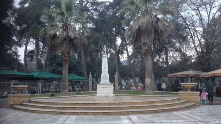 Στην αρχική του μορφή, στην ίδια περίπου θέση, ήταν ένα ταπεινότερο μνημείο τοποθετημένο σε μαρμάρινη βάση επί του χαλικοστρωμένου εδάφους του περιβάλλοντος χώρου. Πριν την ανάπλαση του πάρκου στα τέλη της δεκ. του ’90 η πρόσβαση σε αυτό γινόταν από την πύλη που βρισκόταν στη συμβολή των οδών 7ης Μεραρχίας και Μητροπόλεως. Σύμφωνα με τον Παρασκευά Καλπακτσόγλου η συγκεκριμένη πύλη, η οποία έκλεινε με «τρίφυλλη σιδερένια πόρτα», αποτελούσε την κύρια είσοδο στο περίκλειστο τότε πάρκο.