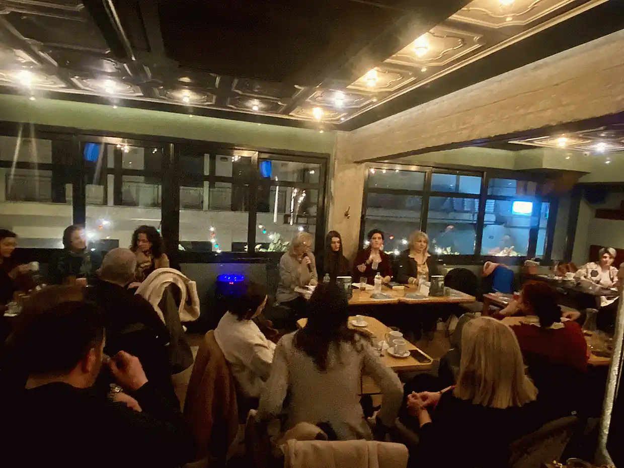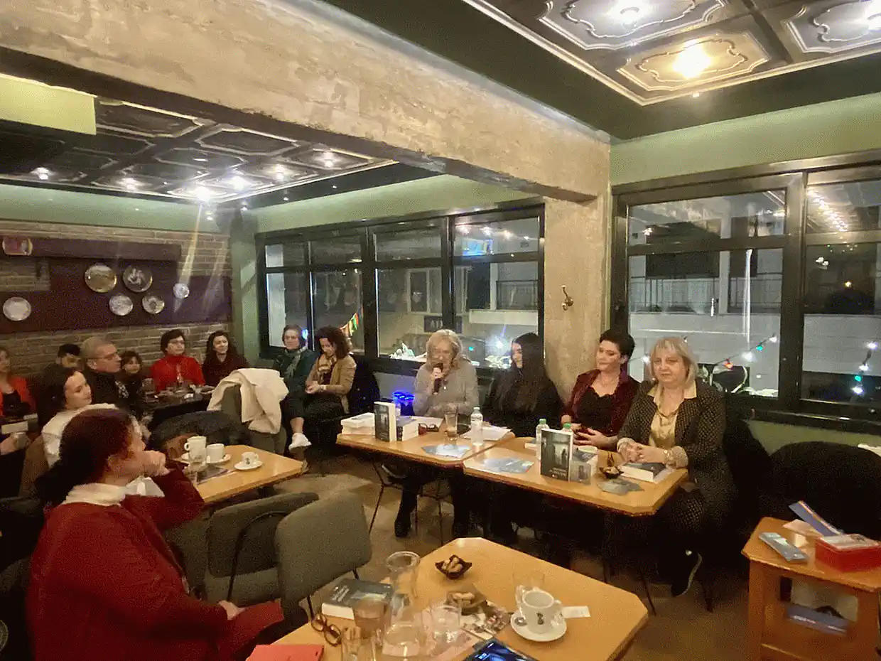 Το κοινό, που γέμισε ασφυκτικά το πατάρι του «Μαγιά και Βύνη» συνομίλησε με τη συγγραφέα και απόλαυσε τη ζεστή ατμόσφαιρα της λογοτεχνικής συνάντησης.