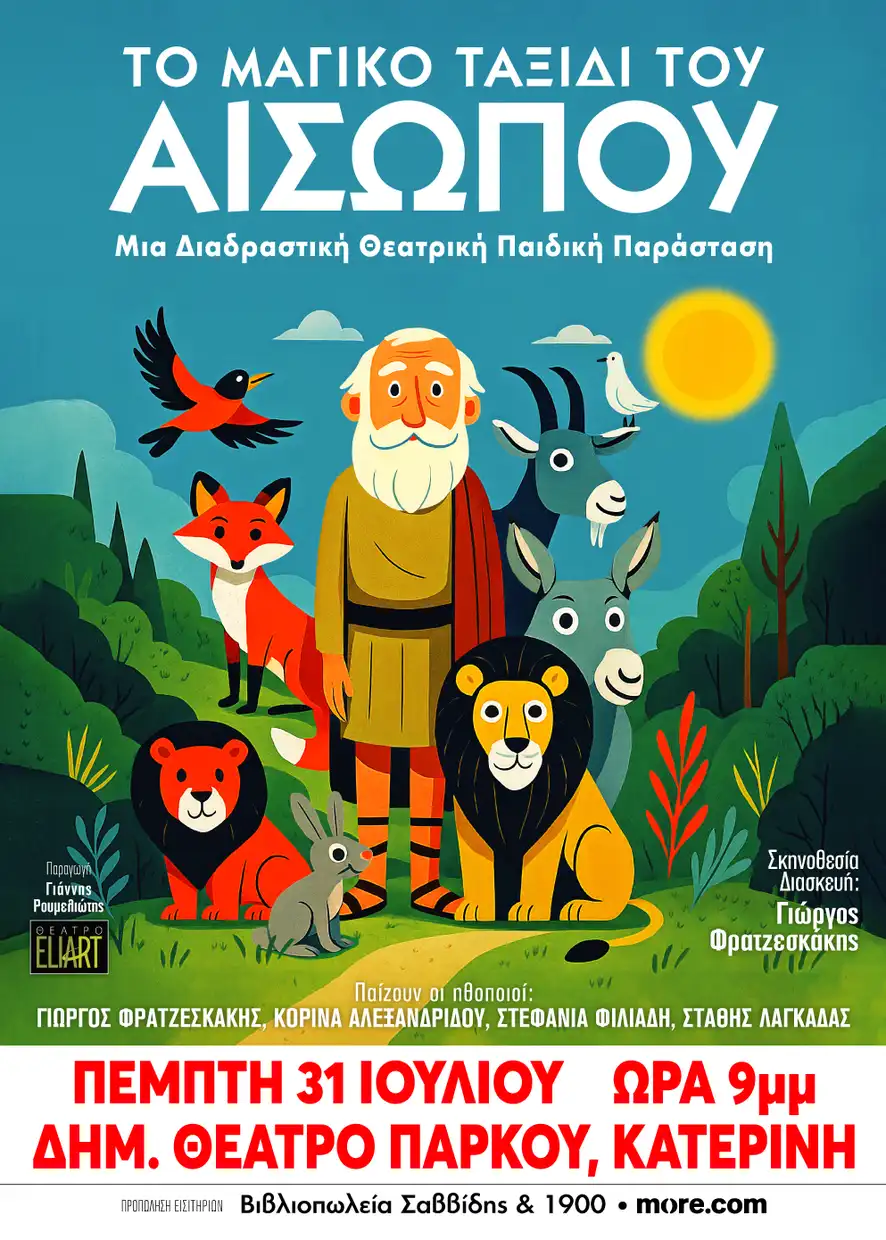 Το Θέατρο Ελιάρτ περιοδεύει σε όλη την Ελλάδα και σας καλεί να ακολουθήσετε τον Αίσωπο σε ένα μαγευτικό ταξίδι αναζήτησης της γνώσης, παρακολουθώντας την παιδική διαδραστική παράσταση «Το μαγικό ταξίδι του Αισώπου», την Πέμπτη 31 Ιουλίου και ώρα 9.00μμ στο Δημοτικό Θέατρο Πάρκου Κατερίνης.