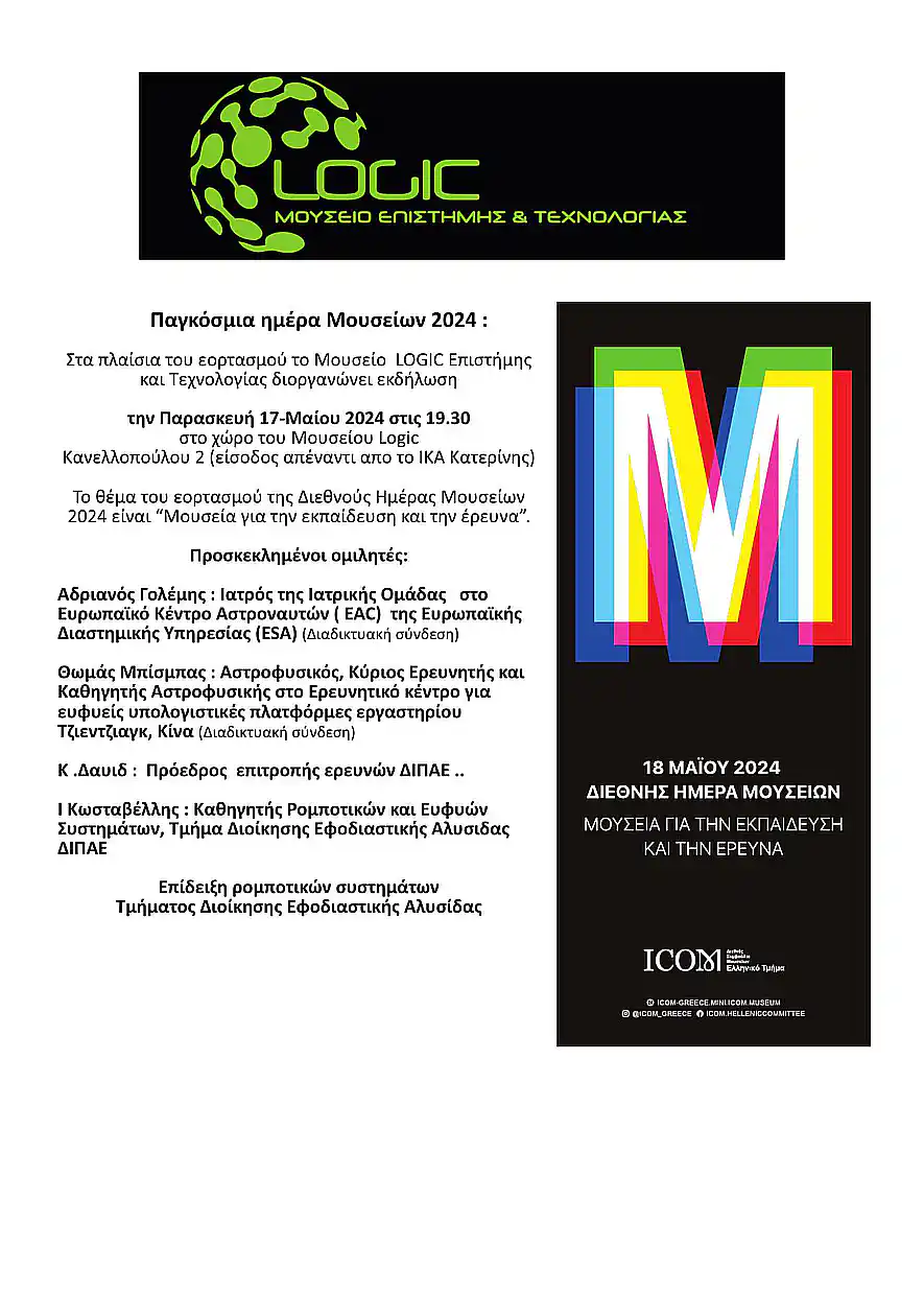 Στα πλαίσια του εορτασμού της Παγκόσμιας Ημέρας Μουσείων ,  το Μουσείο  LOGIC Επιστήμης και Τεχνολογίας του Τμήματος Διοίκησης Εφοδιαστικής Αλυσίδας  του ΔΙΠΑΕ  διοργανώνει εκδήλωση την Παρασκευή 17 Μαίου 2024 στις 19.30 στο χώρο του Μουσείου ( Κανελλοπούλου 2 , Κατερίνη)