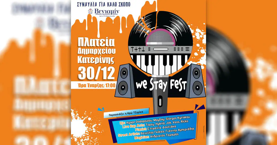 Το We Stay Fest θα λάβει χώρα στην Πλατεία Δημαρχείου στις 30/12 κι η ώρα έναρξής του θα είναι στις 17:00. Ξεκινώντας με ένα δυνατό setlist από 3 αγαπημένους Djs της πόλης πάνω σε ήχους techno, rnb, trip hop &, hip hop, με τον καθένα να έχει διαγράψει τη δική του μουσική πορεία, τη σκυτάλη θα πάρουν οι rap artists και θα φροντίσουν να δώσουν τα right vibes για την υπόλοιπη βραδιά. Φύγαμε για ανοιχτά jam sessions με εναλλαγές σε duos & trios! Με ένα προσεκτικά επιλεγμένο line up αποκλειστικά δικών τους τραγουδιών, οι Κατερινιώτες-ισσες καλλιτέχνες-ιδες είναι έτοιμοι να κάνουν τη διαφορά.