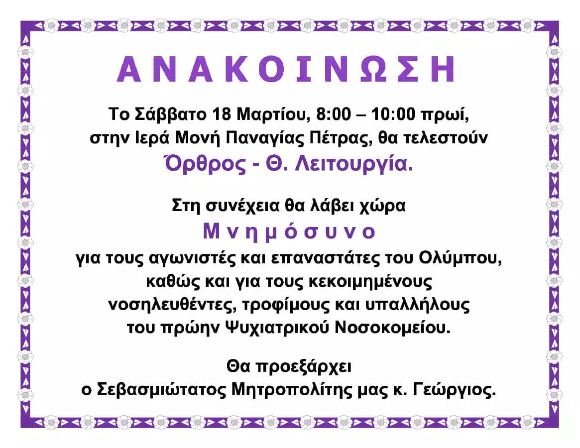 Το Σάββατο 18 Μαρτίου στην Ιερά Μονή Παναγίας Πέτρας Ολύμπου