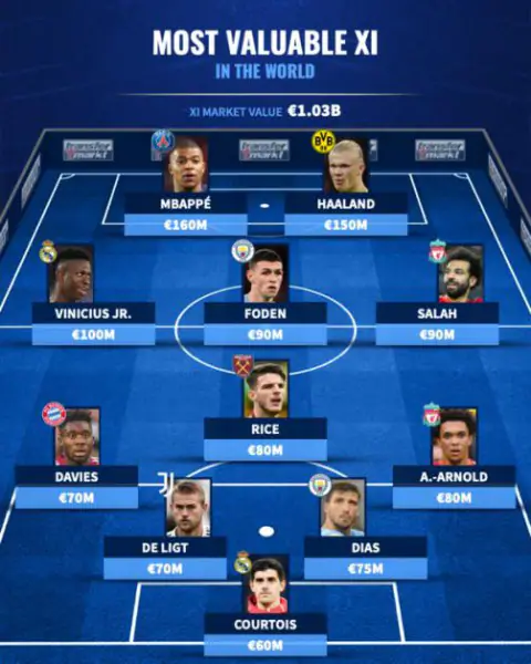 Στην ενδεκάδα κυριαρχεί η Premier League, η οποία έχει πέντε παίκτες, εκτός του Χάαλαντ που… μετακόμισε πρόσφατα από τη Ντόρτμουντ: Φιλ Φόντεν (Μάντσεστερ Σίτι/90 εκατ.), Τρεντ Αλεξάντερ-Άρνολντ (Λίβερπουλ/80 εκατ.), Μοχάμεντ Σαλάχ (Λίβερπουλ/90 εκατ.), Ρούμπεν Ντίας (Μάντσεστερ Σίτι/75 εκατ.), Ντέκλαν Ράις (Γουέστ Χαμ/80 εκατ.). Ο Βινίσιους Τζούνιορ της Ρεάλ Μαδρίτης έφτασε τα 100 εκατομμύρια ευρώ τον Δεκέμβριο του 2021.