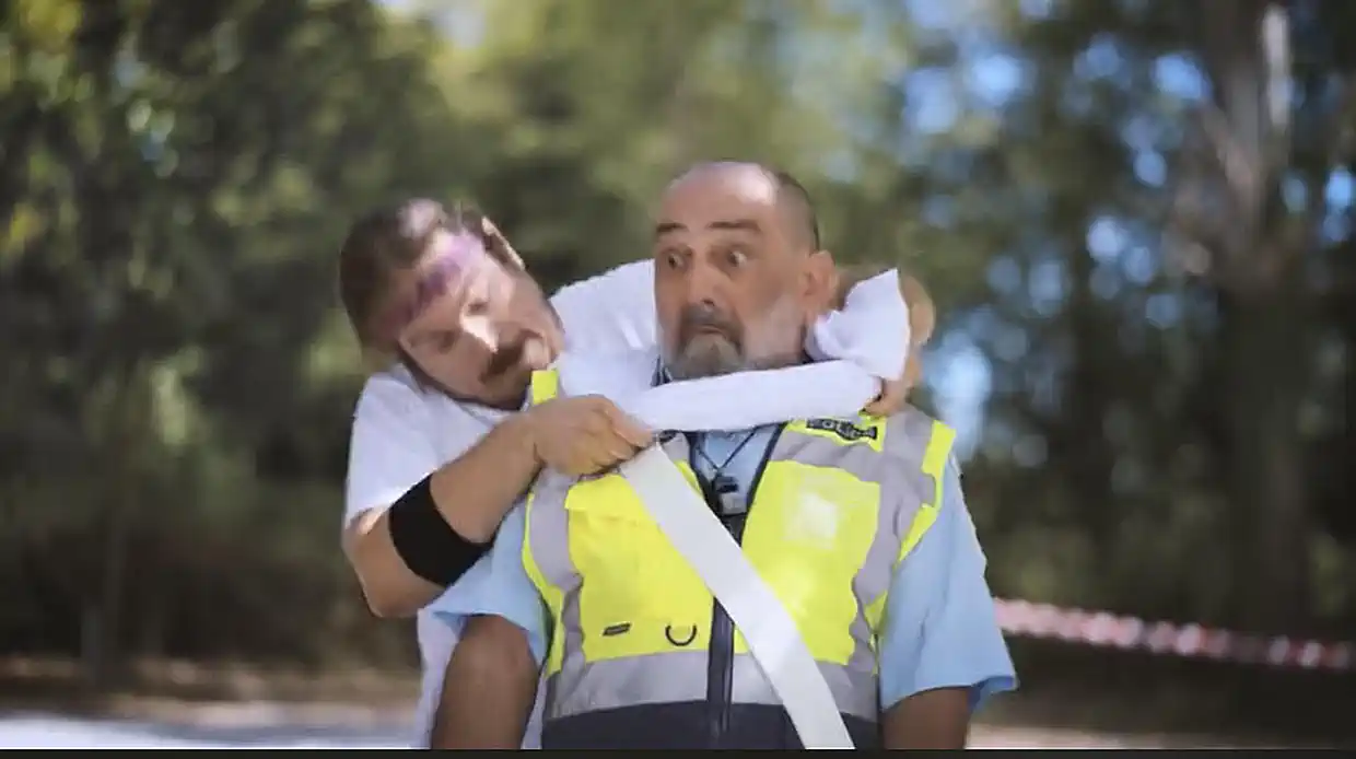Όλα αυτά γυρισμένα στην Κατερίνη με όχημα της Δημοτικής Αστυνομίας και με φόντο το βουνό των Θεών τον Όλυμπο.