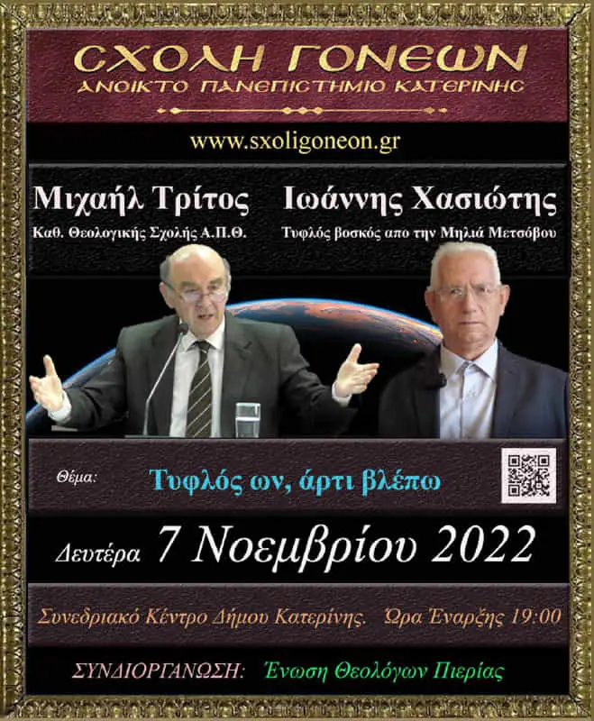 Είναι ένα παγκόσμιο φαινόμενο εκμαθήσεως της Καινής Διαθήκης, όπως θα διαπιστώσετε από τις ερωτήσεις που θα του κάνετε. Είναι έγγαμος και πατέρας τριών τέκνων. Τον χειμώνα διαμένει στα Γρεβενά και το καλοκαίρι στη Μηλιά Μετσόβου. Η εκδήλωση γίνεται σε Συνδιοργάνωση με την Ένωση Θεολόγων Πιερίας.