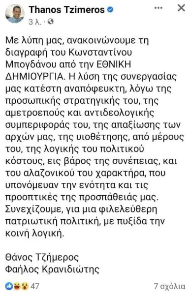 «Με λύπη μας, ανακοινώνουμε τη διαγραφή του Κωνσταντίνου Μπογδάνου από την ΕΘΝΙΚΗ ΔΗΜΙΟΥΡΓΙΑ. Η λύση της συνεργασίας μας κατέστη αναπόφευκτη, λόγω της προσωπικής στρατηγικής του, της αμετροεπούς και αντιδεολογικής συμπεριφοράς του, της απαξίωσης των αρχών μας, της υιοθέτησης, από μέρους του, της λογικής του πολιτικού κόστους, εις βάρος της συνέπειας, και του αλαζονικού του χαρακτήρα, που υπονόμευαν την ενότητα και τις προοπτικές της προσπάθειάς μας. Συνεχίζουμε, για μια φιλελεύθερη πατριωτική πολιτική, με πυξίδα την κοινή λογική.