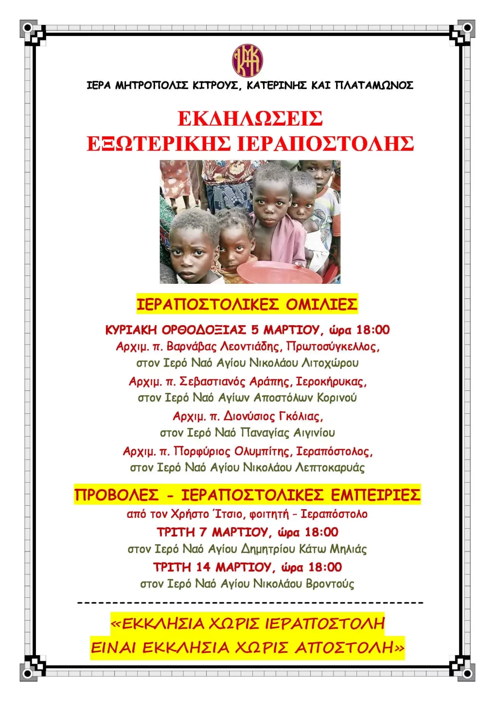 Tην Κυριακή  5 Μαρτίου, Κυριακή της Ορθοδοξίας, ξεκινούν οι εκδηλώσεις που διοργανώνει το Γραφείο Εξωτερικής Ιεραποστολής της Ιεράς Μητρόπολης Κίτρους, Κατερίνης και Πλαταμώνος με τίτλο: «Εκκλησία χωρίς Ιεραποστολή είναι Εκκλησία χωρίς Αποστολή», στο πλαίσιο της «Εβδομάδας Εξωτερικής Ιεραποστολής» που έχει ορισθεί από την Ιερά Σύνοδο της Εκκλησίας της Ελλάδος.