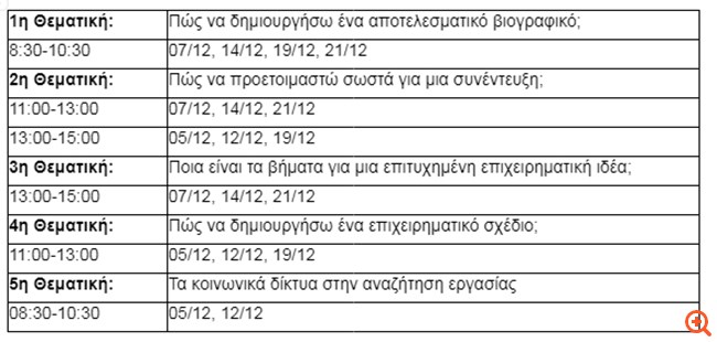 Όλοι όσοι αναζητούν εργασία και επιθυμούν να αναβαθμίσουν τις δεξιότητές τους στη διαχείριση της σταδιοδρομίας τους, μπορούν να παρακολουθήσουν e- Εργαστήρια στις εξής θεματικές ενότητες: