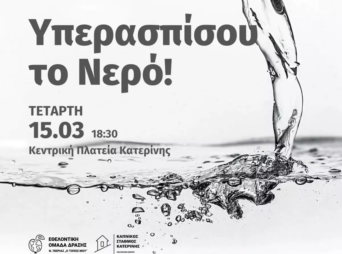 Την Τετάρτη 15 Μαρτίου 2023, στις 18:30, στην Κεντρική Πλατεία Κατερίνης, με πρωτοβουλία της Εθελοντικής Ομάδας Δράσης Ν. Πιερίας «Ο ΤΟΠΟΣ ΜΟΥ» και σε συνεργασία με τα σωματεία εργαζομένων της ΔΕΥΑ Κατερίνης και ΕΥΑ Θεσσαλονίκης, πραγματοποιείται δημόσια συζήτηση για την ιδιωτικοποίηση του νερού.