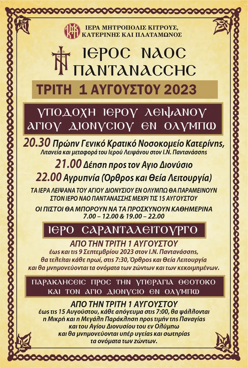 Υποδοχή Ιερών Λειψάνων Αγίου Διονυσίου εν Ολύμπω και Θεομητορικό Σαρανταλείτουργο στην Παντάνασσα